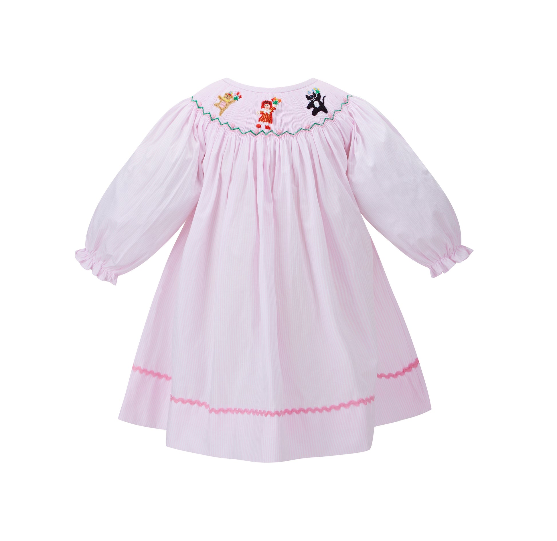 Adorn your little one in sweet sophistication with our Baby Pink Stripe Long-Sleeved Dress. Hand-smocked with intricate details of a bear, a girl, and a cat.