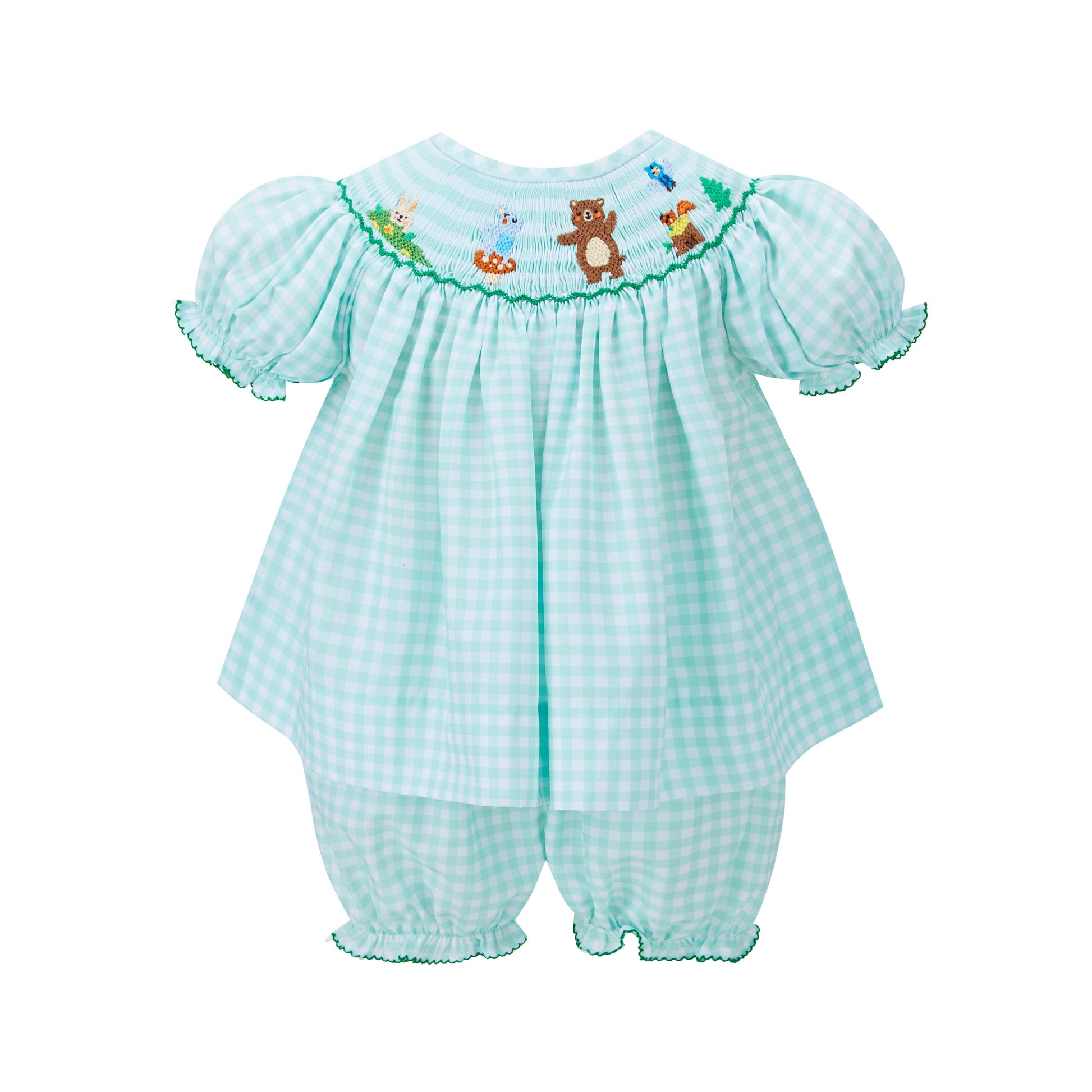 Discover whimsical charm with our Aqua Gingham Short top and bottom set, showcasing hand-smocked details of a bunny, mouse, bear, squirrel, and owl. This delightful ensemble brings a touch of woodland magic to your little one's wardrobe, perfect for playful days and sunny smiles.